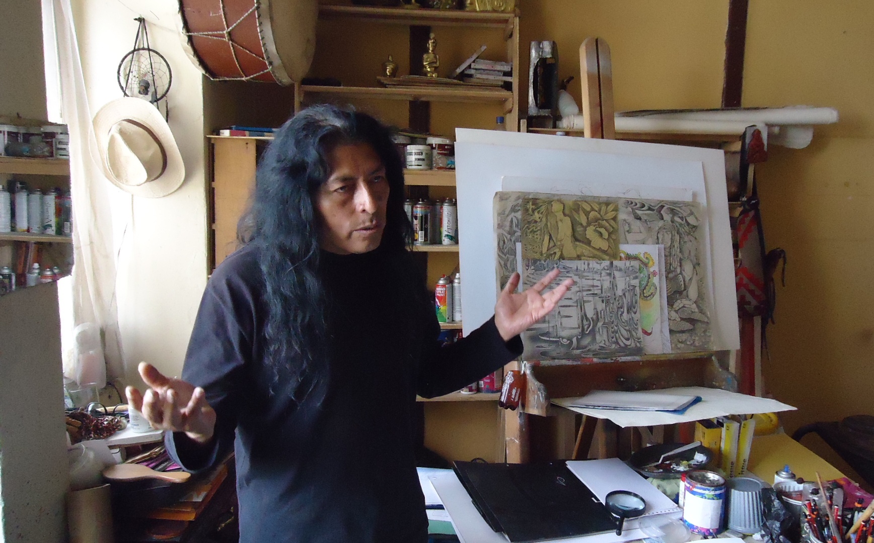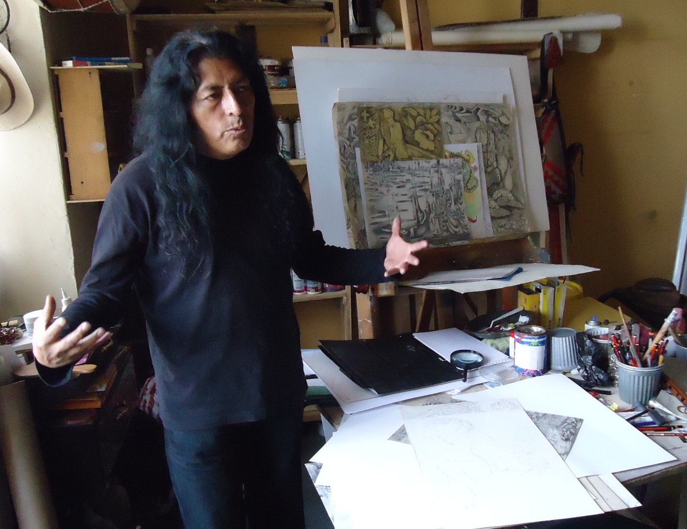El planteamiento del dibujo y de la pintura mía desde la cosmovisión andina tiene que ver con quito, tiene q ver con mi país y cuando hablo d quito no me refiero a la parte física de quito porque quito era 3millones 200 mil km de territorio que tenemos parte de chile, parte de Perú Bolivia, Brasil teníamos territorio hasta centro américa.