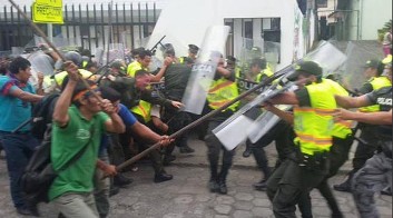 Además un video subido en la red social muestra cómo los indígenas usan sus lanzas contra los escudos de los policías, golpean a la fuerza pública, que retrocede ante el avance de los manifestantes sin herirlos. Varios de los uniformados acaban incluso en el suelo durante la protesta. Morona Santiago sufre jornadas de violencia desde el pasado jueves, cuando la Confederación de Nacionalidades Indígenas del Ecuador (Conaie) convocó a un levantamiento.
