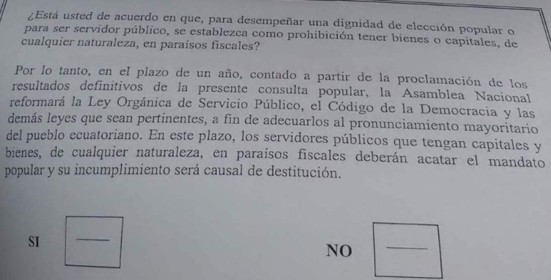 En el plazo de un año, contado a partir de la proclamación de los resultados definitivos de la presente consulta popular, la Asamblea Nacional reformará la ley Orgánica de Servicio Público, el Código de la Democracia y las demás leyes que sean pertinentes, a fin de adecuarlos al pronunciamiento mayoritario del pueblo ecuatoriano. En este plazo, los servidores públicos que tengan capitales y bienes, de cualquier naturaleza, en paraísos fiscales deberán acatar el mandato popular y su incumplimiento será causal de destitución.