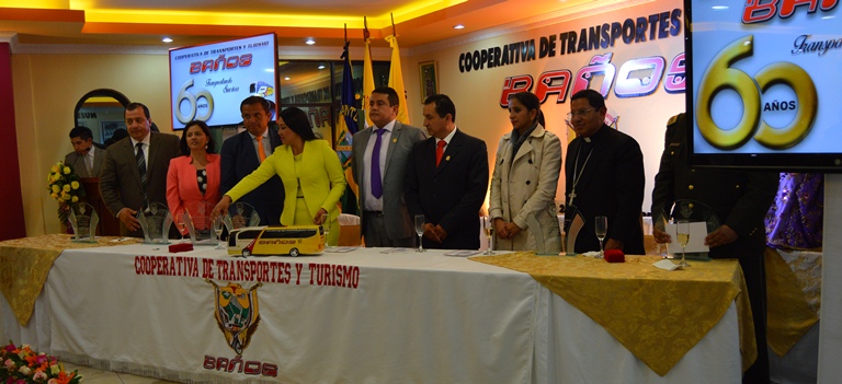 “Tenemos que reconocer a todos aquellos empresarios transportistas que hacen quedar bien al Estado, he aquí un ejemplo más. Esta cooperativa ha hecho una inversión, de unos 20 millones de dólares en el desarrollo del País”. Esto somos los humildes transportistas que aportamos y generamos riquezas en el País creando fuentes de trabajo de forma directa e indirecta, para beneficio ciudadano. Gracias cooperativa “Baños” por hacernos quedar muy bien. Esta es una fiel demostración de Organización y de cómo se debe hacer empresa en lo concerniente a la movilidad. Hay mucho por hacer pero creo que estos son los mismos ejemplos de las otras organizaciones de transporte que nos siguen día a día, dando buenos ejemplos y saben la senda por donde tienen que caminar. Caminante no hay camino se hace camino al andar, y esta cooperativa con sus 60 años ha demostrado que ha hecho un buen andar. Hoy es justo que nuestra organización que representa a la transportación, le rinda un efusivo homenaje y decirle a todos sus asociados que estamos junto a ellos para seguirles apoyando en todo lo que necesiten y es muy grato de que sigan sirviendo al País sin ningún interés, sino sólo servir que es nuestro lema.
