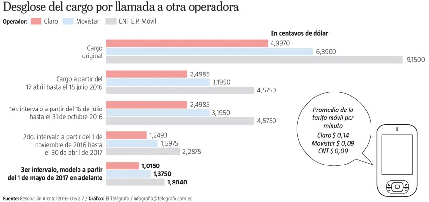 La tarifa que una operadora telefónica cobra por recibir llamadas de otra compañía no superará los $ 0,02. Redacción Economía Los cargos de interconexión de las operadoras de telefonía móvil estarán por debajo de $0.0180 a partir de mayo, según la Agencia de Regulación y Control de Telecomunicaciones (Arcotel). La reducción gradual de la tarifa está vigente desde julio del año pasado, cuando la entidad emitió la resolución 0627.