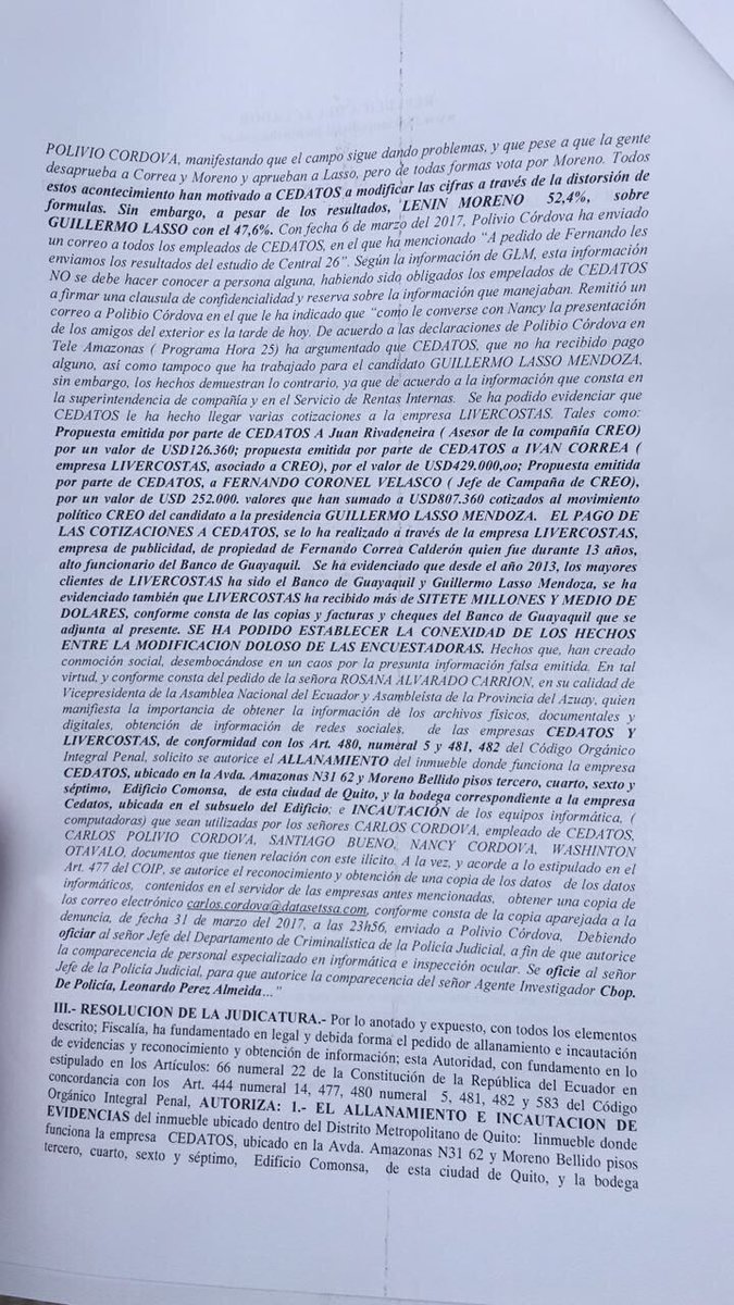 “Funcionarios de Cedatos utilizan basureros para quemar información. Autos que trataron de escapar con información fueron detenidos. Polibio Córdova (principal de Cedatos) huyó en un auto BMW con dos computadoras y una caja fuerte. La Policía todavía no determina ubicación de Polibio Córdova quien huyó con dos computadoras y una caja fuerte”, reportó dicho portal