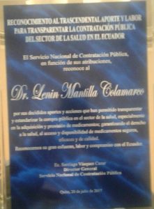 “Mientras en alguna instancias del país y del mundos se busca desvirtuar el tema de la salud, haciéndonos pensar que la salud tiene que ver con la adquisición de medicamentos de marca o a ciertos contratistas; mientras las 5 empresas transnacionales más importantes concentran entre 4 y 5 veces el PIB del Ecuador, el hecho de que ustedes, día adía realicen la gestión de los recursos del Estado de forma transparente, buscando la efectividad en los recursos, es un elemento a relievar”, dijo Vásquez.
