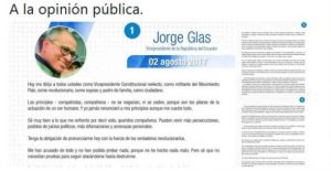 Glas -al igual que el expresidente Rafael Correa, esta mañana- denunció que «hoy se sientan las bases para un Estado de corrupción, al pactar con personajes nefastos de la historia nacional, como los Bucaram, al entregar servicios e instituciones a personas vinculadas con el pasado oscuro del país: la banca del Feriado Bancario, los malos empresarios acostumbrados a explotar a sus trabajadores, los de las barcazas, los que pretendían quebrar al Estado para privatizar y hacer grandes negocios, los seudo-sindicalistas acostumbrados a tener privilegios».
