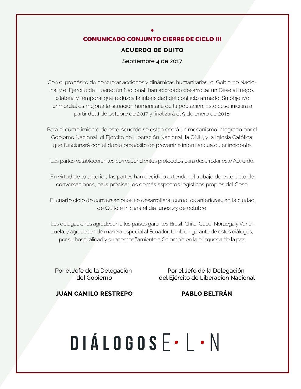 El anuncio se realizó en presencia del Comandante Pablo Beltrán, jefe de la delegación de Paz del ELN, así como de Juan Restrepo jefe negociador Colombia. El cese al fuego temporal entre el gobierno de Colombia y la guerrilla ELN empezará a regir desde el 1 de octubre y obliga a los rebeldes a poner fin a los secuestros, informó el presidente Juan Manuel Santos. «Entrará a regir el próximo 1 de octubre.