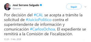 El presidente de la Asamblea, José Serrano, anunció mediante Twitter que el CAL aceptó a trámite la solicitud de juicio político. El expediente se remitirá a la Comisión de Fiscalización.