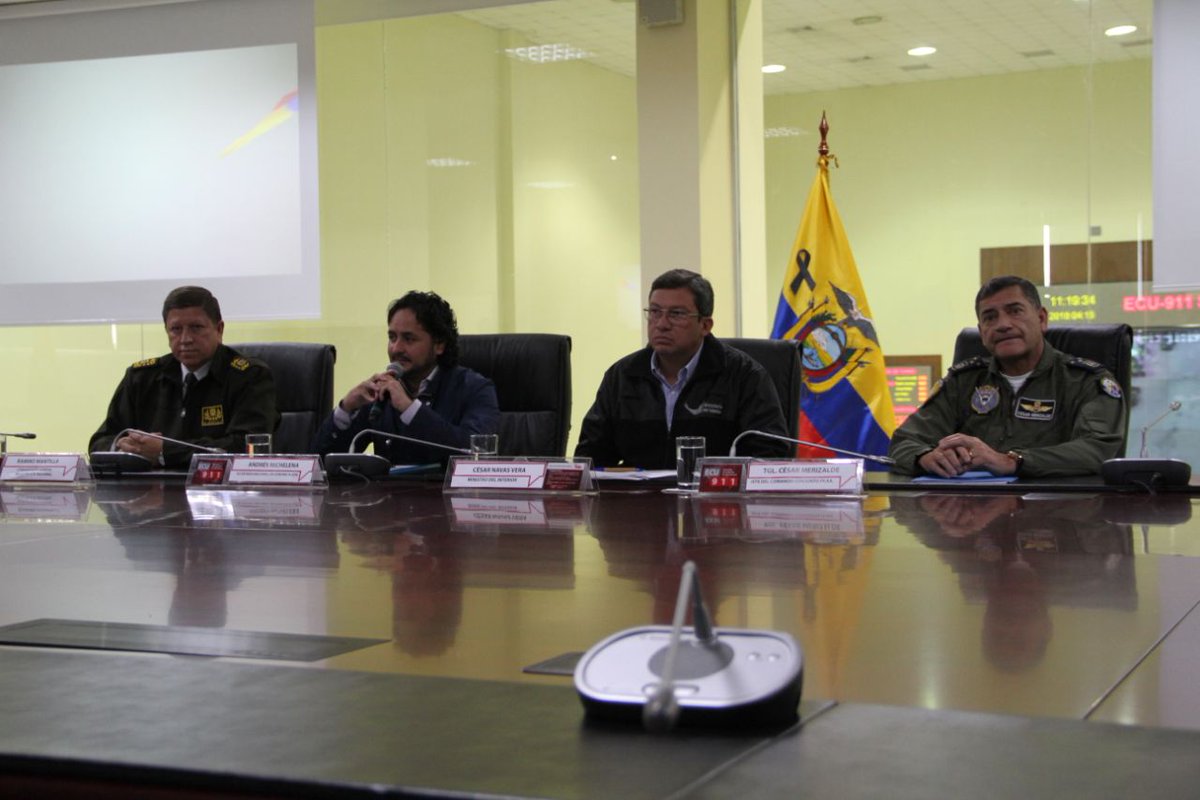 El Ministro junto al Jefe del Comando Conjunto de Fuerzas Armadas Tntgral. César Merizalde y el Comandante de la Policía, Gral. Ramiro Mantilla, informaron hoy en el ECU 9 1 1 acerca de los operativos realizado en la frontera norte tras la confirmación del asesinato del equipo periodístico del secuestrados por un grupo disidente de las FARC.