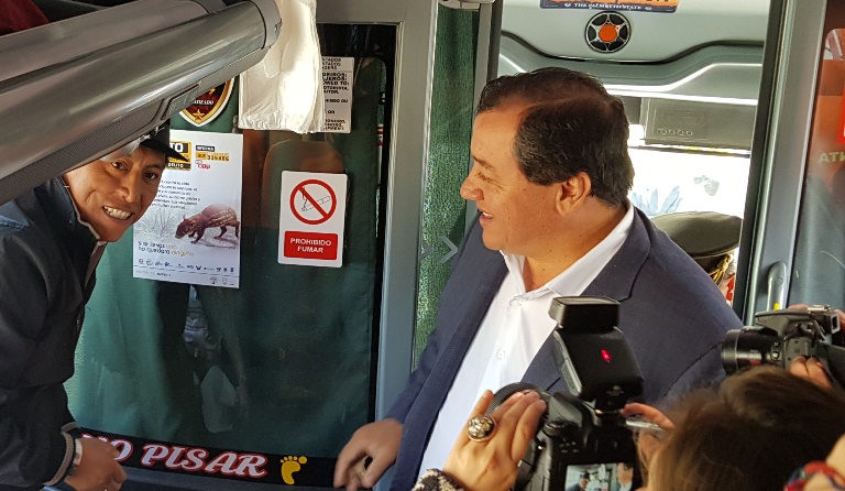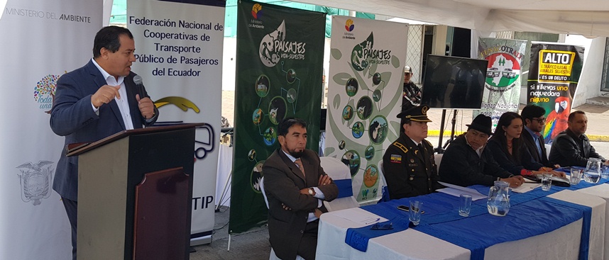 Humberto Cholango, ministro del Ambiente encargado, participo del evento y posteriormente colocó los adhesivos en tres unidades de transporte Interprovincial y de carga liviana.