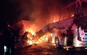 Tras la colisión, la unidad se incendió. Cinco pasajeros y el chofer del bus Aerotaxi disco 38 murieron calcinados, así como el conductor del tráiler.
