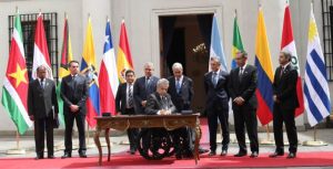 El Presidente de La República, Lenín Moreno puso su firma junto con los otros mandatarios para crear la declaración de Santiago. Chile, Guyana, Brasil, Colombia, Argentina, Perú y Paraguay son los otros países que conformarán a este organismo. El primer Mandatario anfitrión, Sebastián Piñera, fue delegado como presidente de la PROSUR.