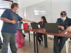Con esto, les hacían sentar en unas sillas de plástico ubicadas bajo la carpa para esperar su turno. Sin mucha demora y en grupos de 10 personas pasaban a dos aulas donde médicos y enfermeras estaban listos para inyectar el remedio a las personas. Antes de colocar el medicamento, los pacientes entregaban los datos principales para el registro, sean beneficiarios de la primera o la segunda dosis.
