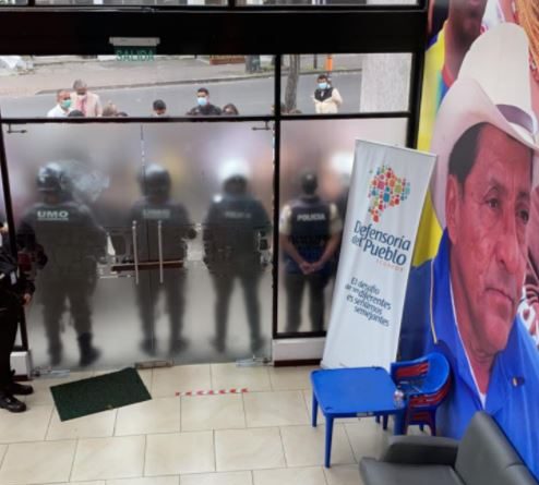 En las afueras del edificio matriz de la Defensoría del Pueblo se registró la presencia de personal de la Policía Nacional, quienes informaron que la Resolución Nº 32 del 18 de junio de 2021, en donde Freddy Carrión Intriago cesó de funciones a la ciudadana ZaidaRovira, y nombró a Tania Castillo como vicedefensora del Pueblo (s), no tiene validez.