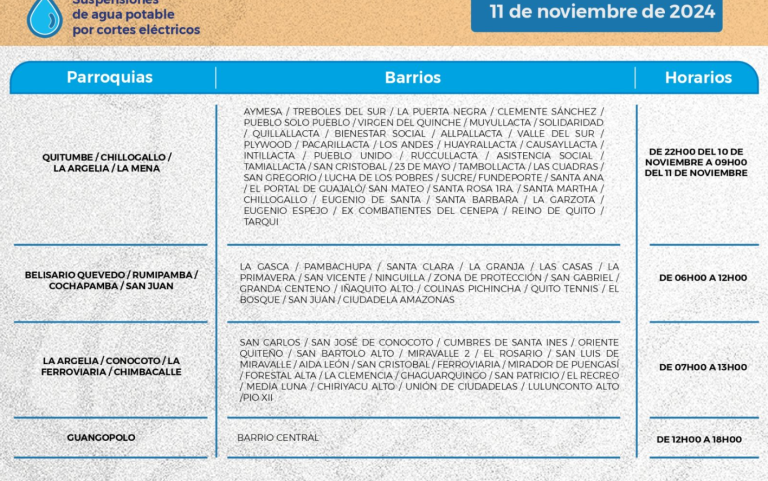 Quito DM. 13 de noviembre de 2024. La Empresa Pública Metropolitana de Agua Potable y Saneamiento de Quito (Epmaps) ha anunciado cortes de agua para este lunes 11 de noviembre, debido a los racionamientos de luz dispuestos por el Gobierno Nacional.