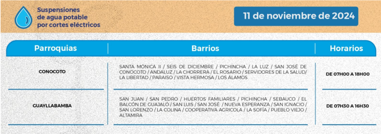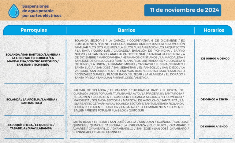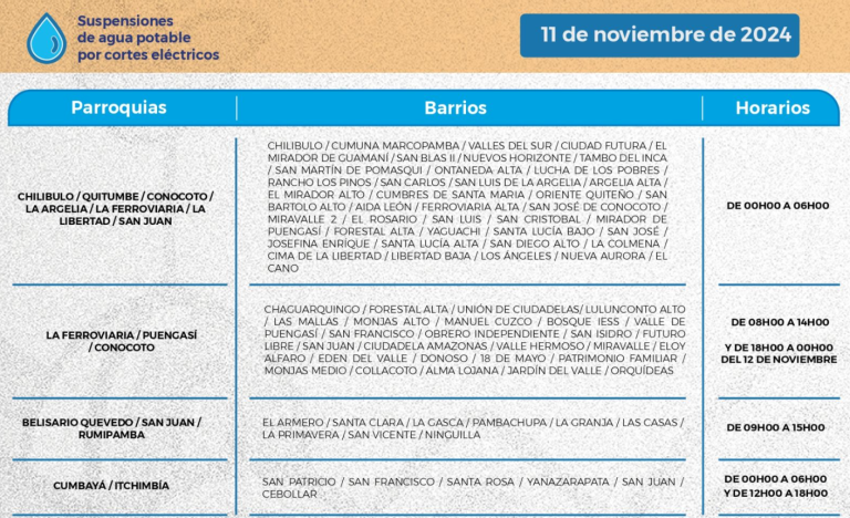 La dotación de agua potable se suspenderá en estos sectores, siguiendo los cronogramas de corte emitidos por la Empresa Eléctrica Quito para hoy. Se recomendó a los residentes de las zonas afectadas abastecerse de suficiente agua para cubrir necesidades básicas de higiene, alimentación y salud.
